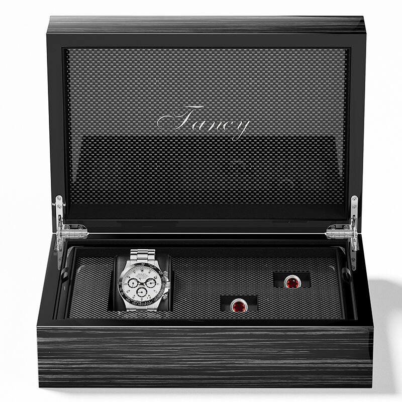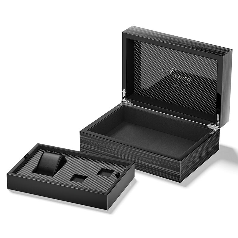 Indulge in contemporary luxury with our Black Textured Wood Watch Case. This mens watch case features a captivating textured finish on premium wood, offering a tactile and visual masterpiece. It provides secure, padded storage, functioning as both a protective watch case box and an elegant display piece. The sophisticated design appeals to those with a modern aesthetic. We provide OEM options to tailor this watch storage case into a bespoke customized watch box. Possibilities include adjusting the texture pattern, adding a branded metal plaque, or creating custom packaging, making it a premier choice for high-end branding.