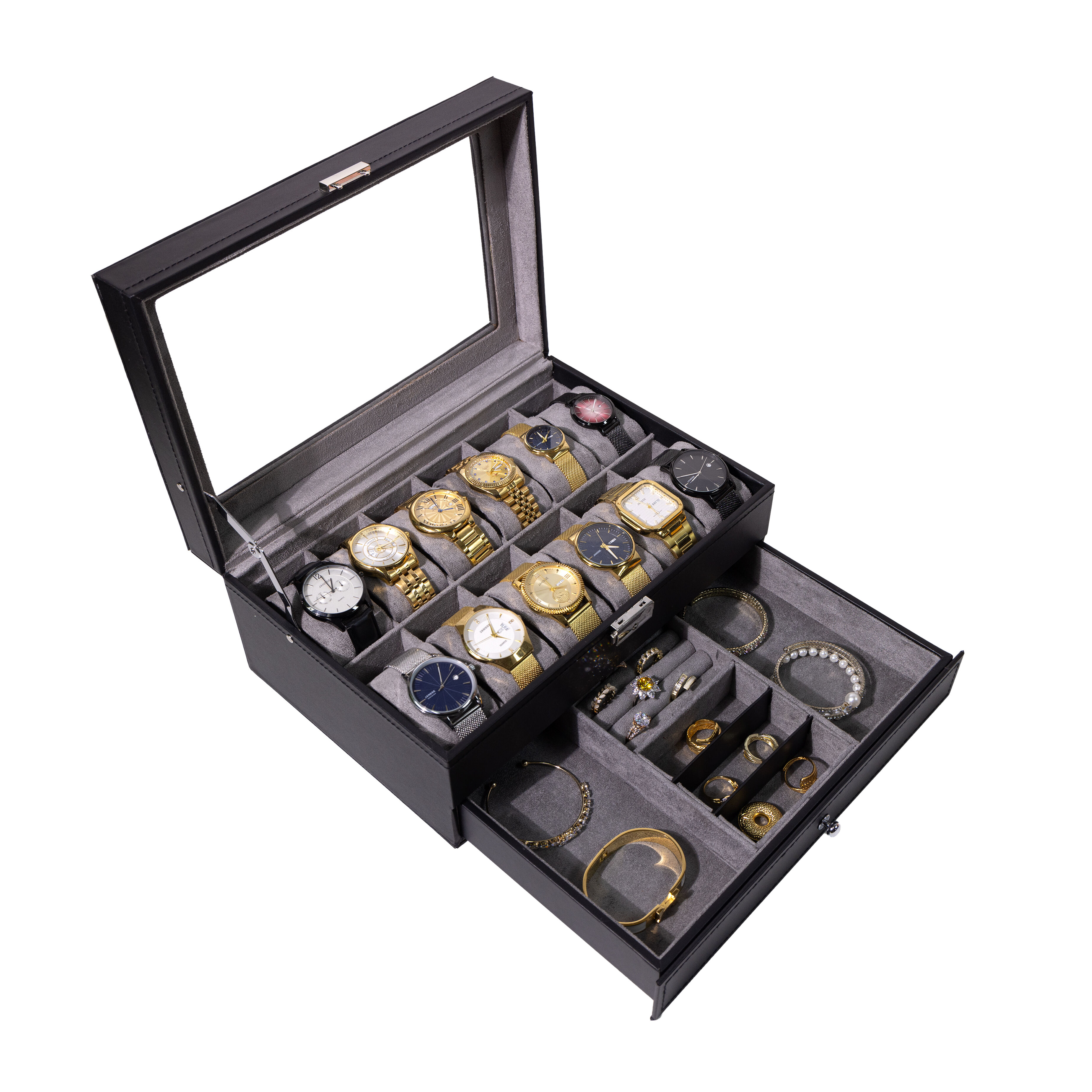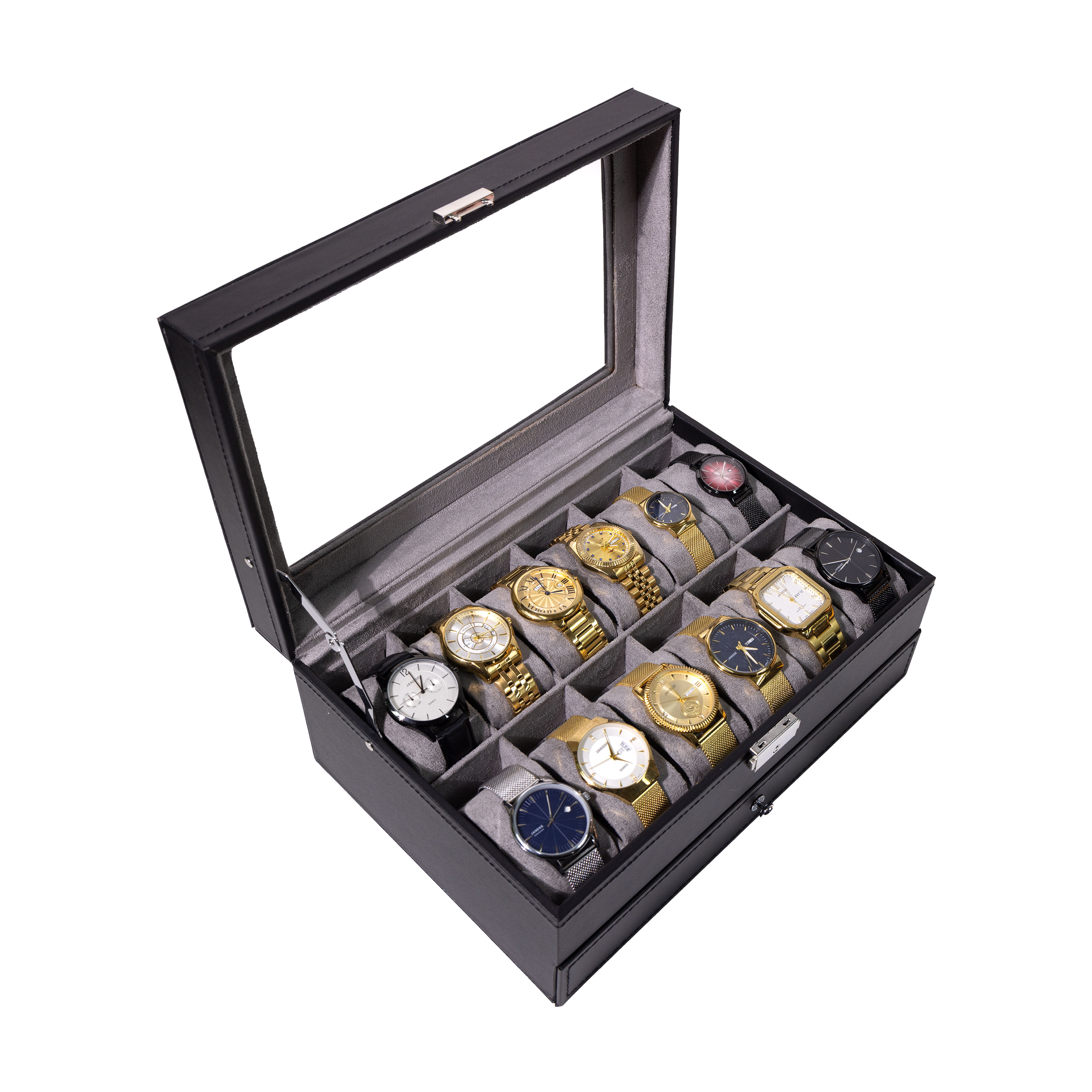 Optimer din opbevaring med vores effektive To-lags sort ure- og smykkeropbevaringskasse . Denne velovervejede design lagertaske har to adskilte lag: en øverste række, typisk udstyret med urpuder til ét eller to ure, og en større nederste skuffe eller kompartment med inddele og ringe til at organisere halskæder, øreringe og andet smykke. Den ensfarvede sorte yderkant giver et elegant og professionelt udseende. OEM-tilpasning tilpasning af denne kasse kan være ret detaljeret, herunder justering af højden på hvert lag for at tilpasse sig forskellige genstande, valg af materiale til indsatserne (f.eks. samt, filt), integration af et lås til sikkerhed og branding af ydersiden med dit logo. Dette produkt er ideelt egnet til organiserede samlers der ejer en række ure og tilbehør og ønsker en enkelt, elegant løsning, der maksimerer pladsen og holder hvert enkelt styk på sin tildelte plads, nemt synlig og tilgængelig.