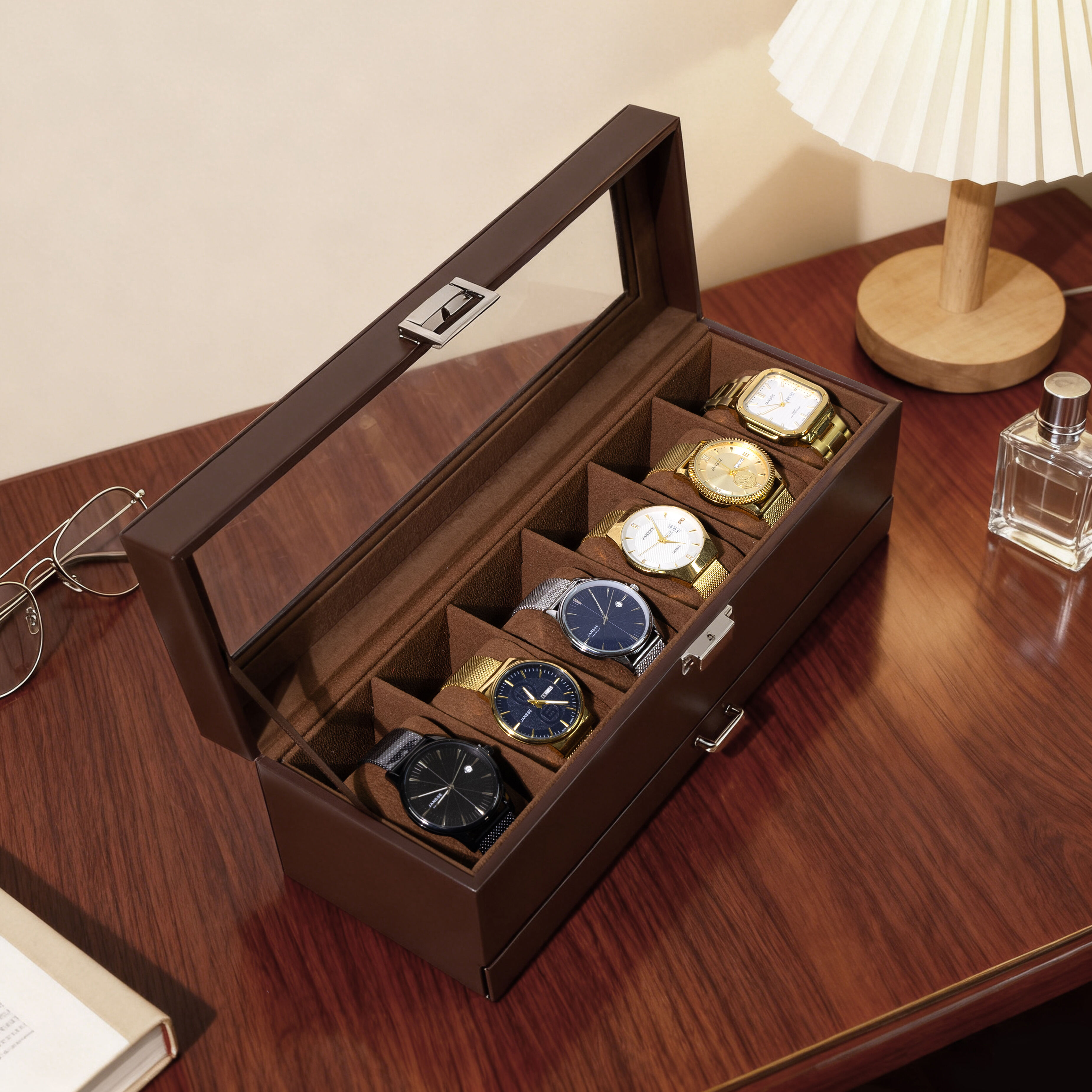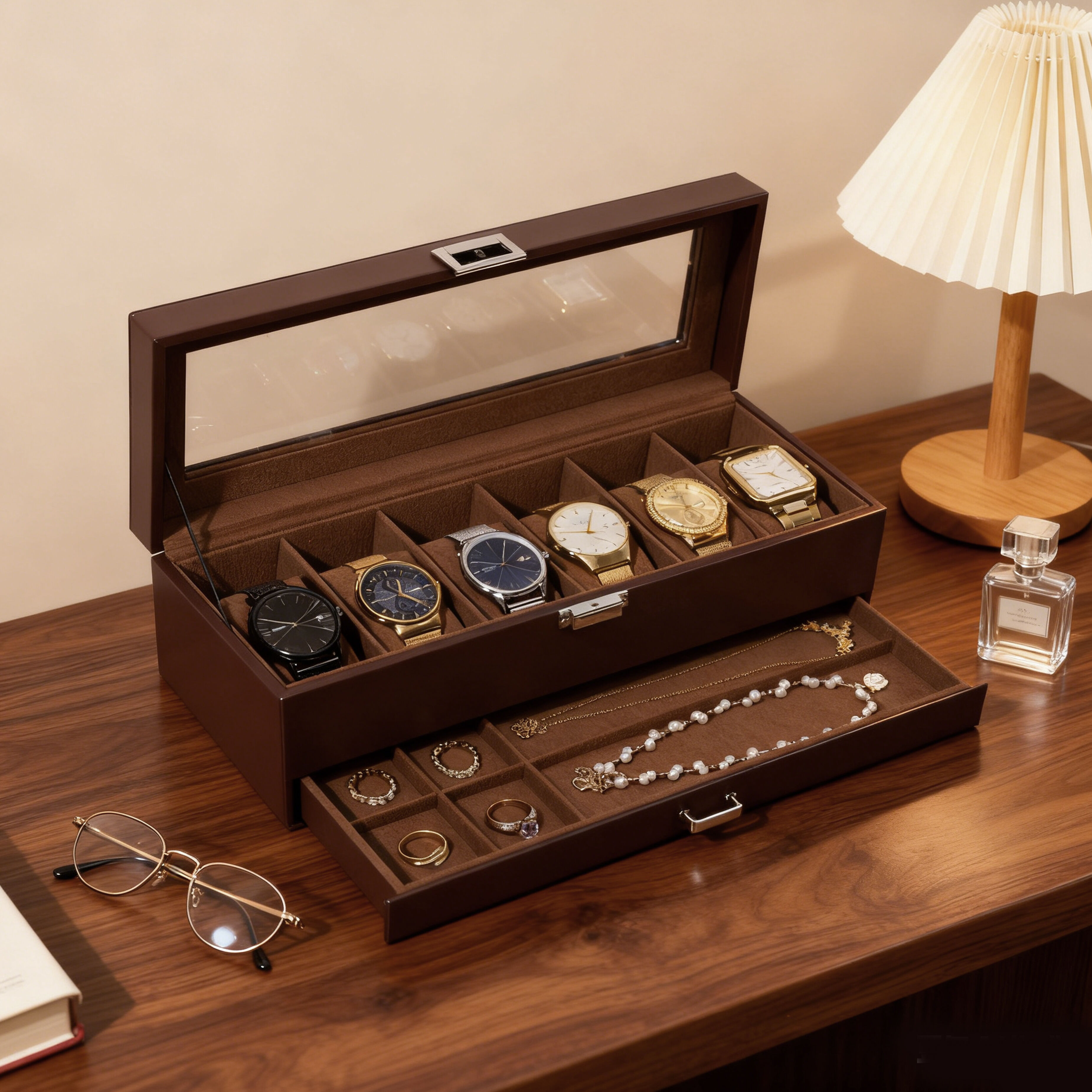 Opnå elegant ordning med vores To-niveau brun smykkedisplayorganisator . Denne praktiske kasse har to adskilte niveauer: et øverste fag med polstrede indfaldsspor specielt designet til ure samt en nederste skuffe, der er pænt inddelt til ringe, øreringe og halskæder for at undgå sammenfiltretning. Fremstillet i en varm brun finish, giver den et klassisk udseende, der passer til enhver kommode. Vi leverer fuld OEM-tilpasning tilpasselighed for denne organisator, så du kan angive de præcise mål for hvert niveau, vælge typen af inddelingsystem i skuffen, vælge farven på det indvendige stof og tilføje dit brands logo på låget. Denne to-niveau smykkedisplayorganisator er en ideel opbevaringsløsning for personer med en voksende samling ure og smykker, for butikshoteller, der tilbyder faciliteter på værelserne, eller som et generøst og praktisk gavevalg, der kombinerer stil med fremragende funktionalitet. Specifikationer og parametre