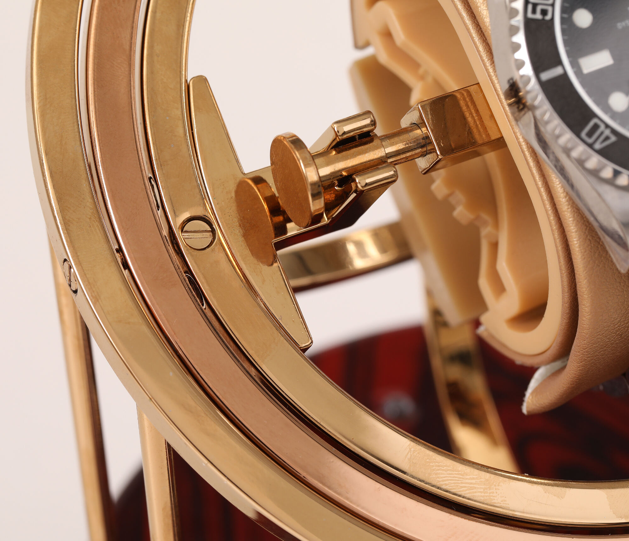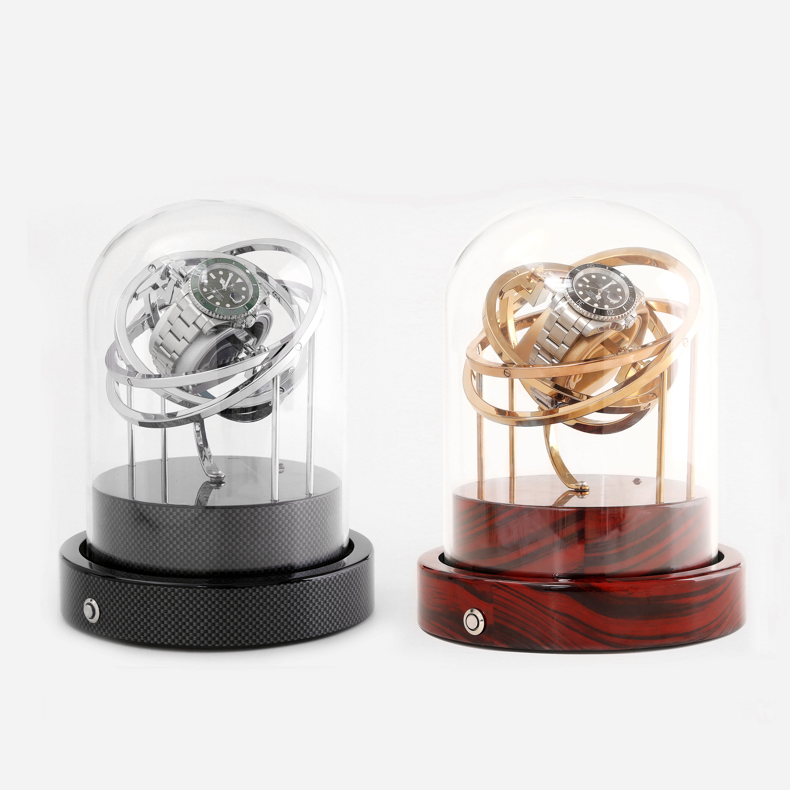 Elegant watch winder for automatic watches under clear glass dome offers 360-degree visibility and protection. This auto watch winder maintains optimal performance with programmable settings. Our OEM options include dome size variations and base materials. Ideal for luxury watch displays and retail showcases.