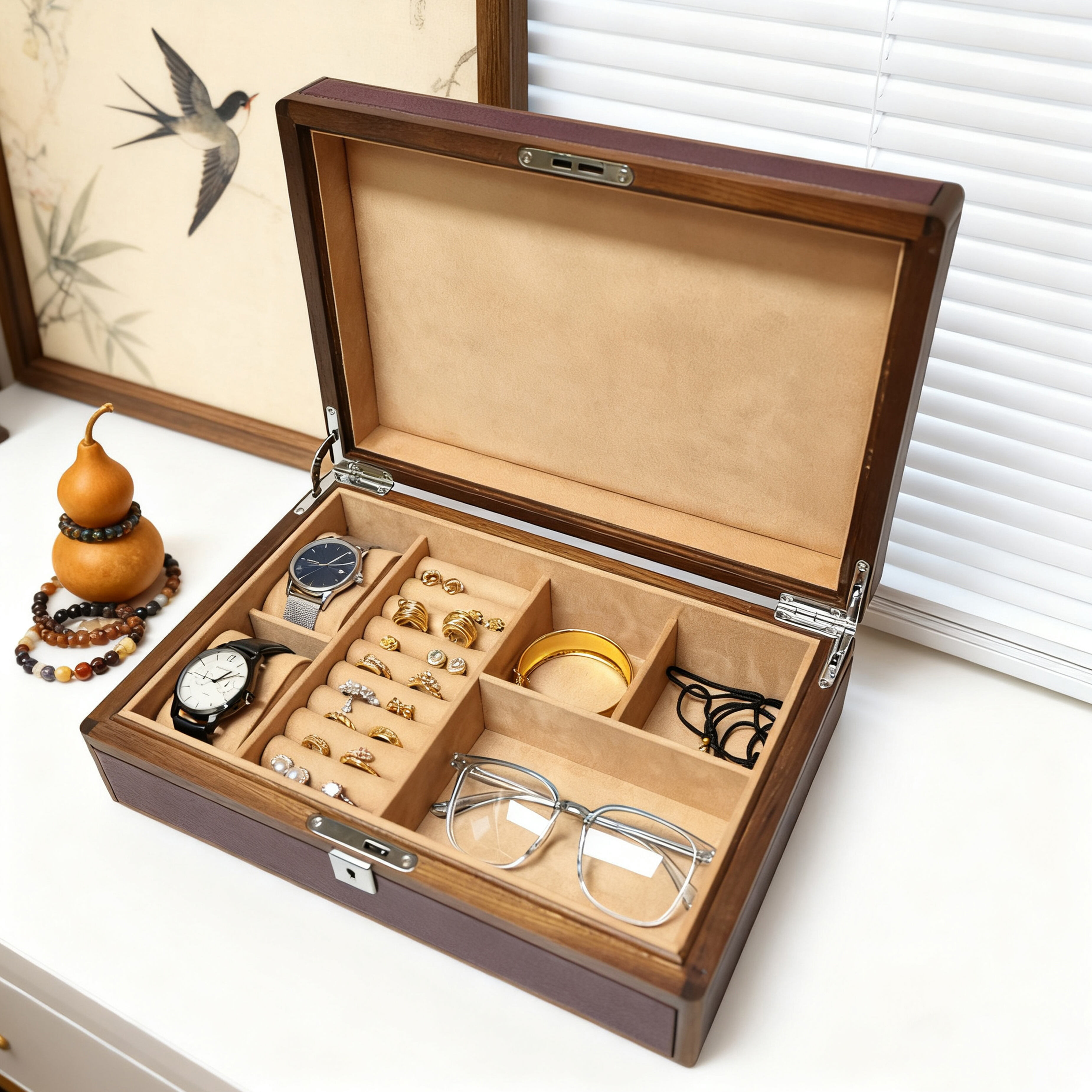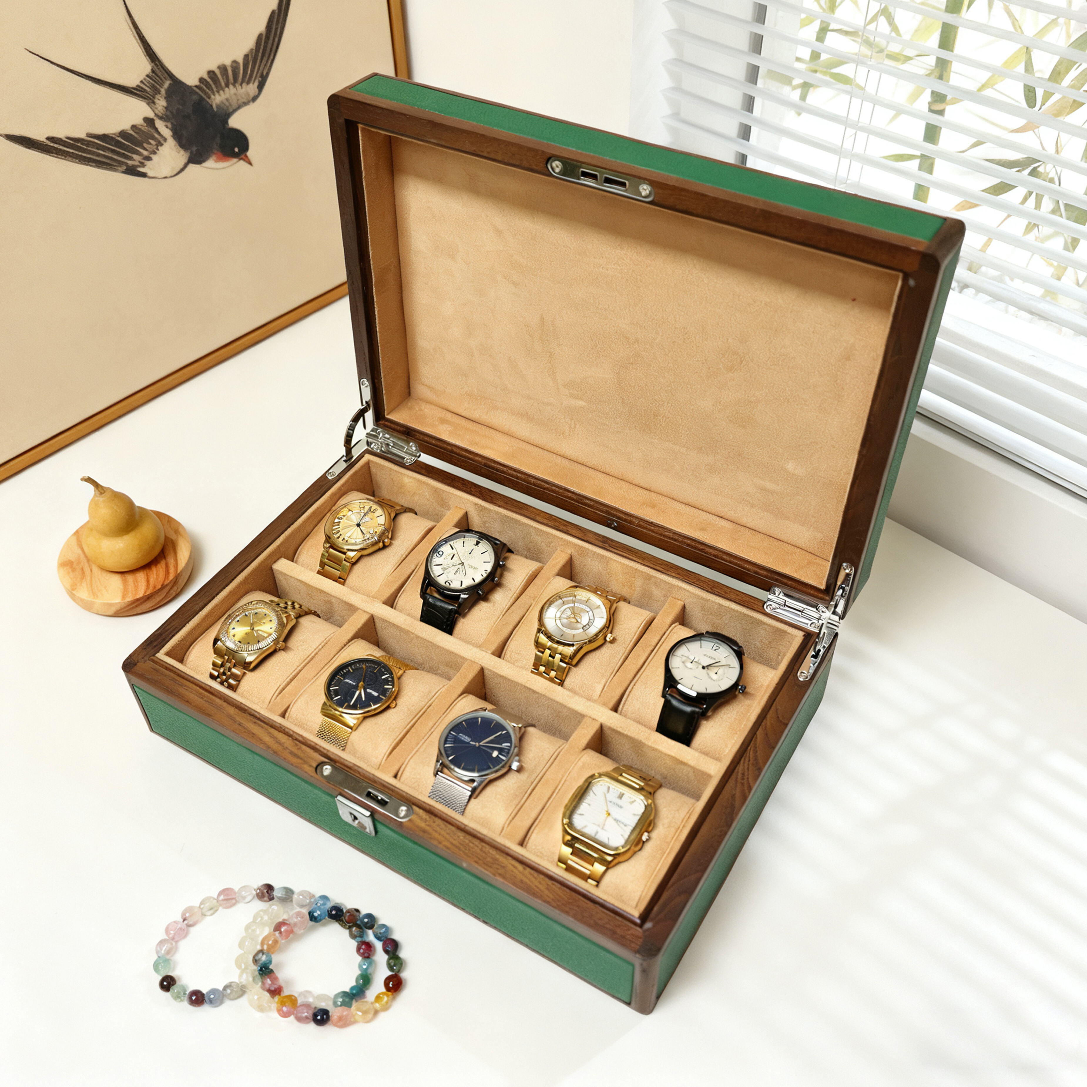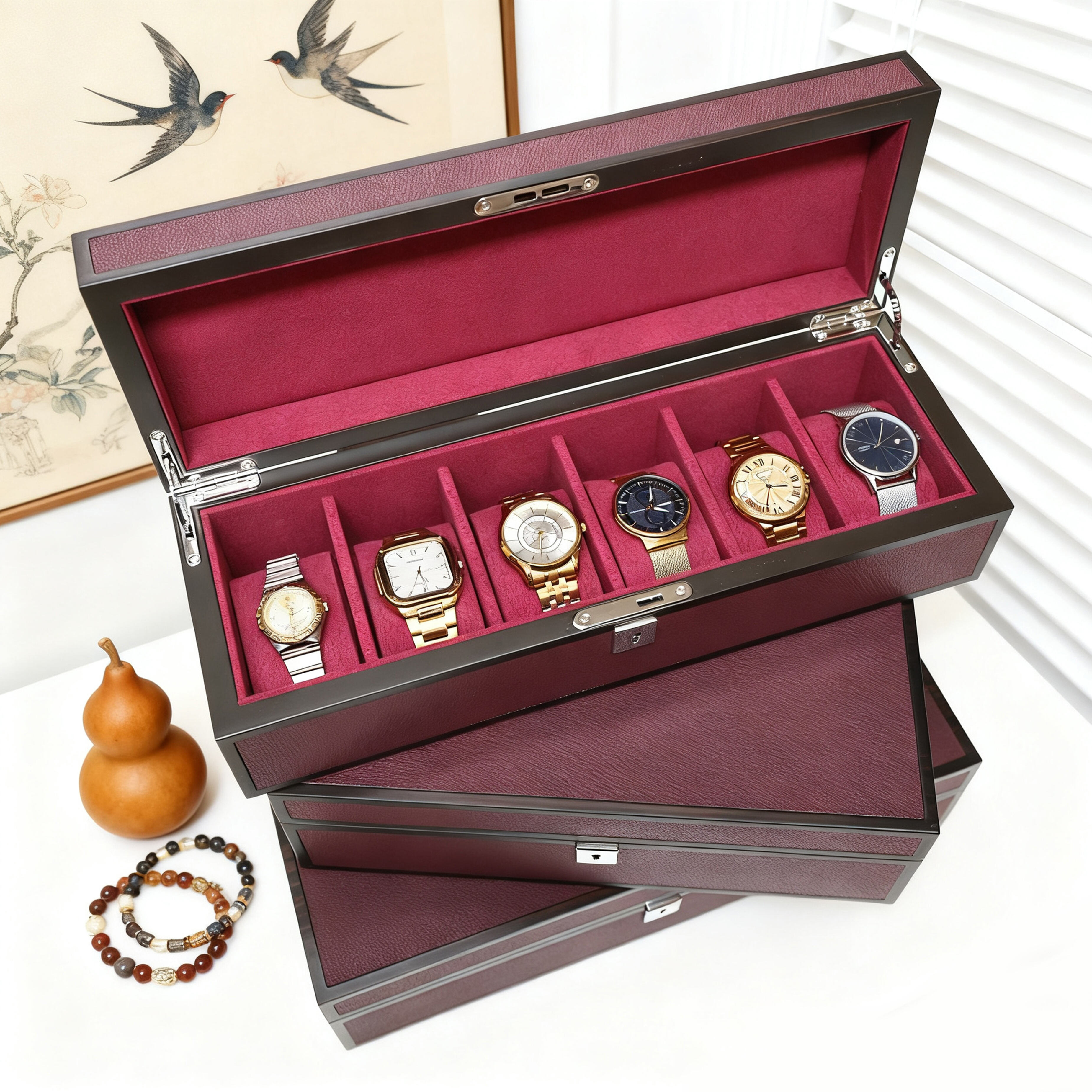The ultimate watch organizer for the discerning collector, this Leather-Finish Multi-Watch Organizer provides a luxurious and practical home for your timepiece collection. Its exterior features a sophisticated synthetic leather that mimics the look and feel of genuine hide, offering a premium aesthetic at an accessible price point. Inside, multiple soft-lined, individual slots keep your watches separated, secure, and free from scratches. This unit is designed for OEM custom watch storage solutions, allowing brands to select custom colors for the leather finish, imprint logos on the lid, and configure the interior layout to accommodate specific watch sizes, creating a cohesive and branded display system for retail or private label clients.