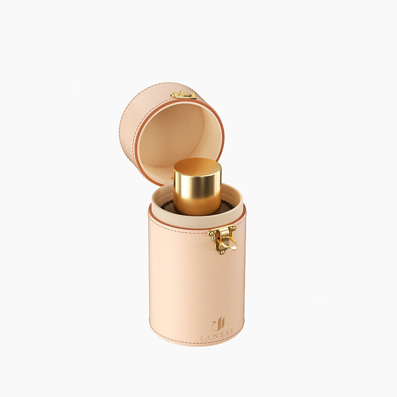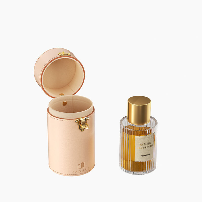 Crafted from genuine leather, this perfume storage roll offers portable protection for up to five bottles. Its compact design includes a pull-tab closure. We provide OEM services such as leather embossing. Ideal for perfume enthusiasts and gift sets.