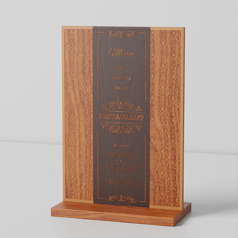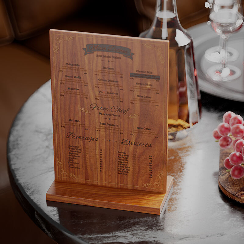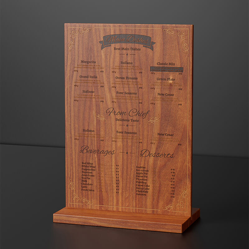 Enhance your restaurant's ambiance with our classic wooden menu board stand. This durable restaurant menu sign is perfect for displaying daily specials, desserts, or wine lists on counters or tables. Its natural look adds a touch of rustic charm. We provide OEM custom menu boards for the hospitality industry, offering customization in size, wood type, and laser-engraved lettering or logos, helping establishments maintain a consistent and professional brand image.