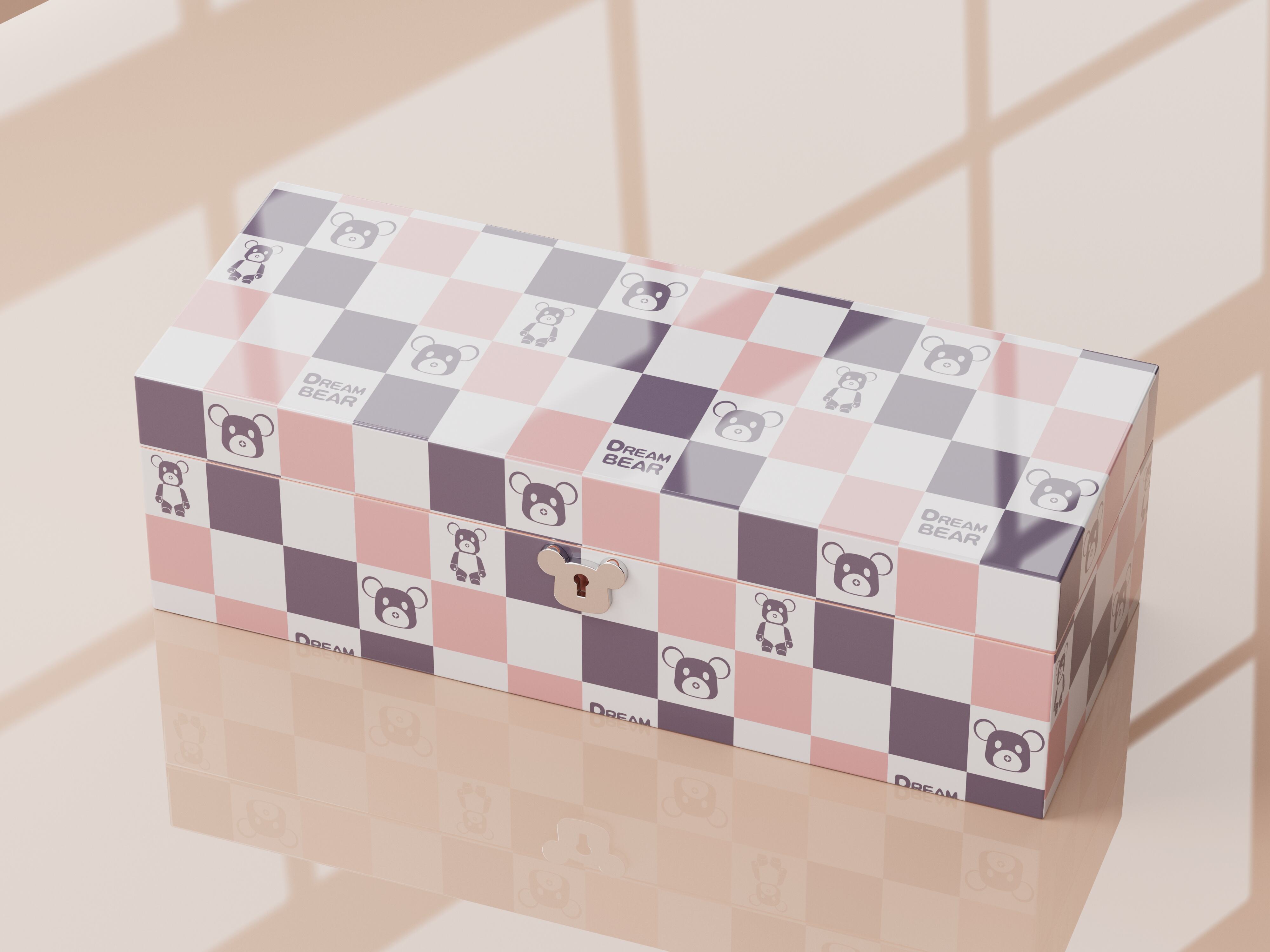 Smyckeslåda för flickor med rymdtema som visar kosmiska björndesign med glittrande detaljer och LED-belysning. Denna smyckesorganisatör har särskilda fack för skatter. Vi erbjuder OEM-anpassning med anpassade konstellationer och ljusfärger. Perfekt för tematiska smyckessamlingar och speciella gåvor.