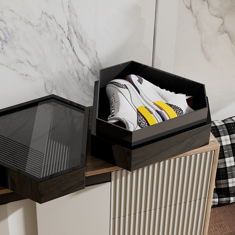 Omforma din garderob med vår triangulära skolåda . Denna moderna skoförvaringsbehållare har en platsbesparande geometrisk design, vilket möjliggör smart stapling och ordning i ditt skokollektiv. Det genomskinliga eller halvgenomskinliga materialet gör att du lätt kan identifiera varje par. Denna anpassad skolåda är perfekt för OEM inom hushållssektorn erbjuder alternativ för anpassade färger, material och varumärkeslösningar och ger en stilren och praktisk förvaringslösning.